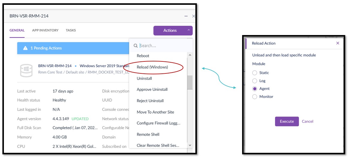 Avoid disrupting the end user by reloading an agent remotely without a reboot right from the Management Console. Reloading the Agent will restart the Agent services and the memory that the Agent is allocating is released. Currently available for Windows.