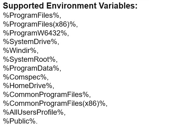 Exclusions for Windows agents can now include non-customizable environment variables in Path exclusions. Using environment variables makes it easier for entering exclusions, reduces the number of exclusions and makes the Exclusions catalog more maintainable. A predefined list of supported environment variables is below.