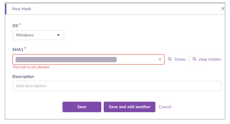 As part of our continued efforts to improve the safety of blacklist and exclusion workflows, users are now prevented from adding some specific hashes to the blacklist. This is to make sure you do not accidentally impact SentinelOne’s detection capabilities in your environment and do not harm your endpoints.
