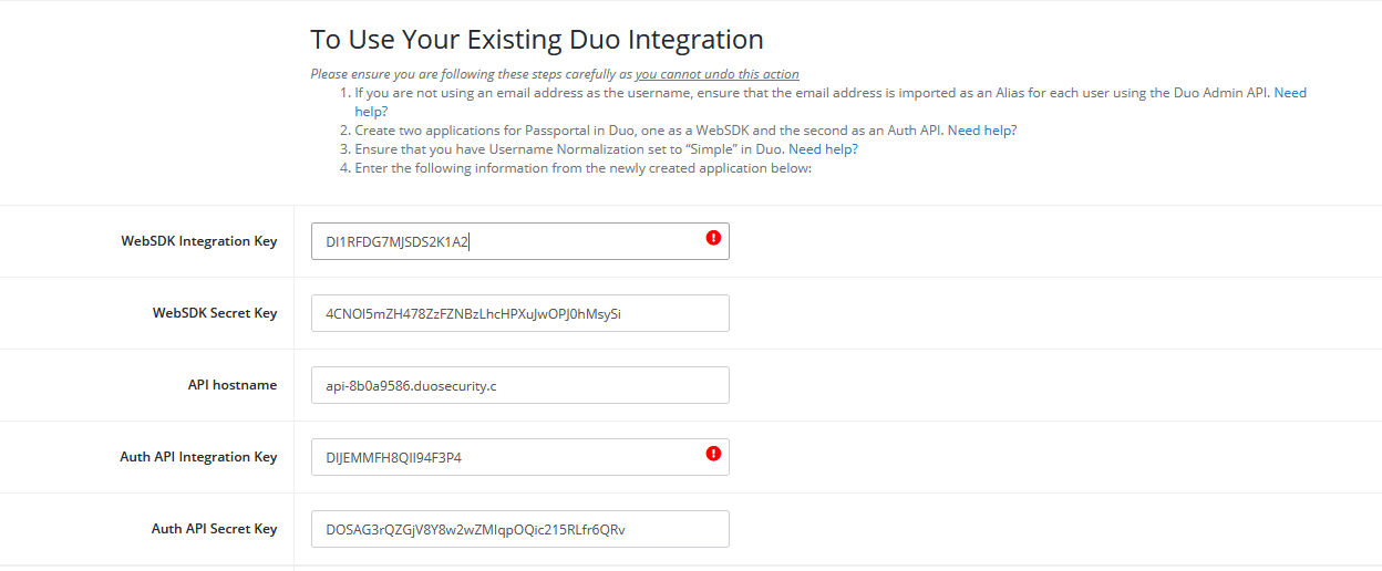 To determine if your MSP is on a Passportal administrated Duo account go Settings -> General -> Multi-Factor Authentication. In here, if you see your api key information filled out (as shown in the image) you do not need to make any changes. If this area is blank, please utilize the free license offering by Duo.