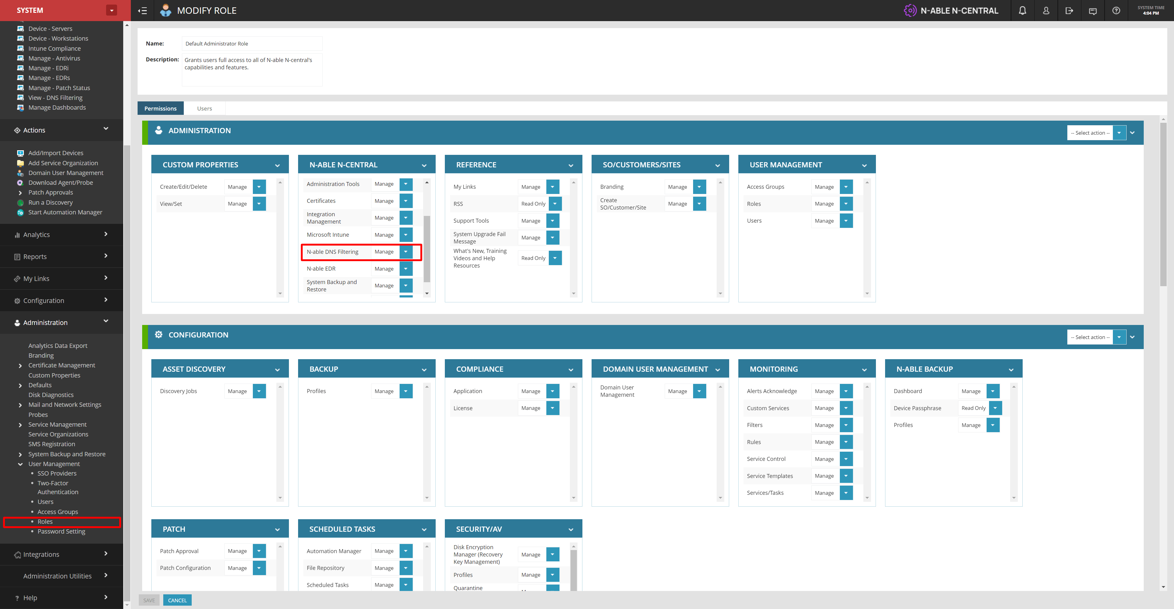 You can modify N-able DNS Filtering permissions to manage access. By default, any users with the “Default Administrator” role will have this permission set to “Manage”.